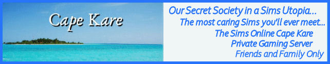 If someone gave you this website, they love and trust you very much. The Sims Online Cape Kare is an exclusive invitation, to friends and family only, into our Secret Society that we've built. We are currently trying to extend our family and friendship, to new players. If you've found this website by an advertisement, Welcome Aboard...